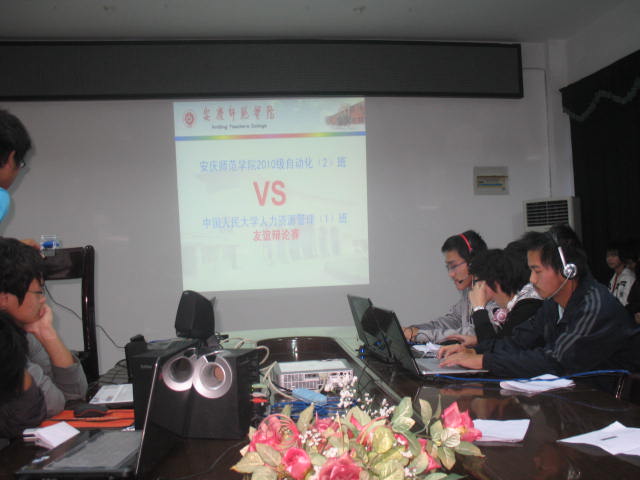 为加强和促进我院学生与名校师生之间的交流和互动,10月25日下午,我院2010级自动化(2)班与中国人民大学人力资源管理2010级(1)班在二楼会议室进行了一场别开生面的网络辩论赛。我院专职辅导员华秀梅和中国人民大学教务处王学军老师对此次辩论赛进行了现场指导。