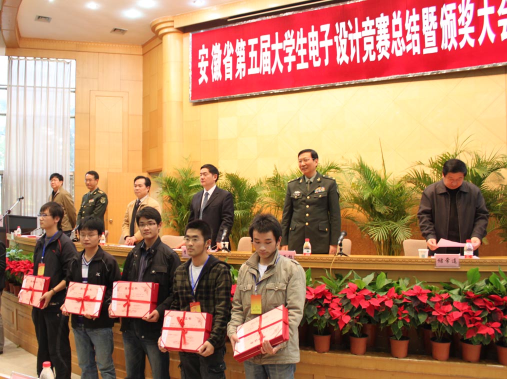 安徽省第五届大学生电子设计竞赛总结暨颁奖大会11月6日在解放军电子工程学院隆重举行。我院副院长江巨浪教授带领指导教师与获奖学生代表一行八人专程到合肥参加了颁奖大会。本次竞赛活动中,我院学生组成的9支竞赛队获得了3个二等奖、2个三等奖的可喜成绩。通过这次竞赛活动,不仅充分体现了我院教师教学水平和学生创新能力,而且还扩大了我校工科专业在安徽省内的影响,进一步强化了我院工科专业以“应用型人才为培养目标”的办学理念。