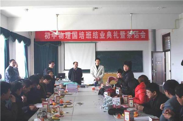 校教务处副处长黄兴帅代表学校讲话。黄处长首先带领大家学习了< <教育部关于中小学教师国培计划的意见>>。接着,他向物理与电气工程学院全体领导及老师对此次国培计划的大力支持表示感谢。他指出,这次国培计划旨在培养一批全省骨干教师,提高他们的教育教学能力,为我省的教育事业发展做出更大贡献。随后,黄处长提出三点建议:一是各位老师及学员应经常联系,互相交流工作中的教学经验,及时反馈教育教学信息;二是,各位学员及时做好培训工作的总结,提炼出优秀的论文及教学思想;三是各位学员发扬示范带头作用,及时推广优秀的教育教学方法,他还要求主办单位及时进行项目总结,做好资料存档工作。学员代表黄三发代表全体学员对物理与电气工程学院精心组织本次培训表示衷心的感谢,相信通过本次培训,学员们必将更快地提升自己,打造高效课堂。副院长江贵生要求各位学员在以后五个月的跟踪指导阶段继续完成各项任务,并在以后的工作中发挥引领示范作用。最后,副院长江巨浪宣读了各种比赛的获奖名单,各位领导与获奖学员代表合影留念。