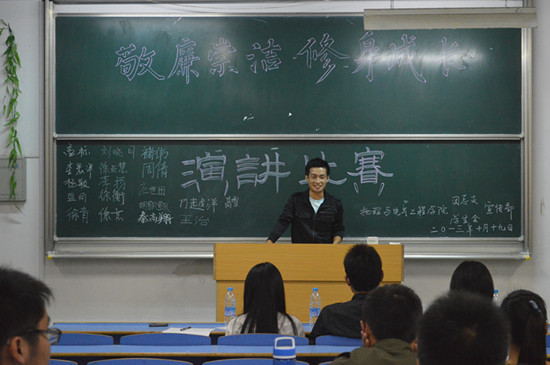 比赛伊始,参赛选手通过对比赛主题的学习和领会,畅谈自己对敬廉崇洁、修身成长的思考和认识,反映了当代大学生把自身的成长发展与祖国、民族的前途相结合的精神情操。参赛选手们慷慨激昂,铿锵有力的语言,娓娓动听的叙述,不时博得了在场观众的阵阵掌声。有的选手以周总理不装饰会议室展开对这个主题的理解,有的选手用诚实正义、恪守信用、光明磊落、崇尚仁德、崇尚修养为切入点向我们阐明修身成长的重要性。在演讲过程中,选手们纷纷表达了从自身做起、坚定信念、乐于付出,把祖国建设成为文化强国而努力奋斗的决心。最后,徐青和秦高翔两位选手以清亮的嗓音、震撼人心、发自肺腑的精彩演讲成功晋级,代表我院参加学校比赛。