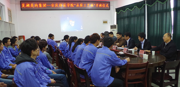 芜湖美的制冷设备有限公司是我院工科学生实习基地、人才培养基地。本次“品质工艺班”是学院与芜湖美的制冷设备有限公司在前期学生实习实践成功合作基础上双方签署的又一项战略合作协议成果。按照协议,芜湖美的将依据企业发展需求,委托安庆师范学院每年在四年级学生中优选30--50名同学进行为期三个月的企业相关工艺品质课程专项培训。授课教师全部由企业人员担任,并无偿捐赠实习实训设备。所有培训课程及管理方式全部按照企业要求进行。本班的开设主要为企业培训基层管理技术人员后备力量,同时也为我校学生搭建了直接进入大型企业管理工作岗位的快车道。( 江伟)