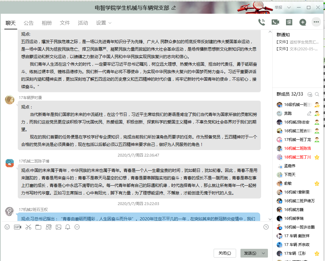 习近平总书记的青春寄语在学生机械支部中引起强烈反响,大家表示要坚定理想信念,站稳人民立场,练就过硬本领,投身强国伟业。