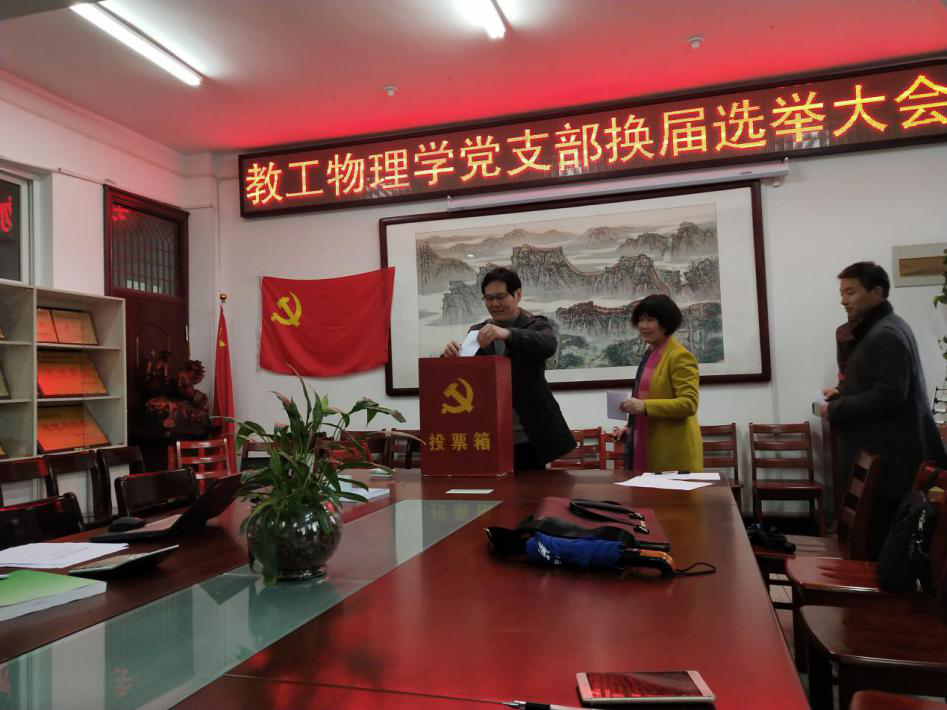3月27日下午,我院教工物理学党支部在稼先楼大会议室举行了党员大会暨支委换届选举大会。教工物理学党支部全体党员参加了会议,本次大会由上届支部书记章礼华同志主持。大会在庄严的国歌声中拉开帷幕。首先,章礼华同志代表上届支部委员会做了工作报告,全面总结了支部的活动开展、自身建设等情况,全体党员对支委的工作给予了高度肯定。按照换届选举工作要求,由工作人员宣读了选举办法,经过民主建议并报院党委同意确定了支委会候选人名单,经党员大会无记名、差额投票,监票人、计票人统计票数,公布选举计票结果,江燕燕、潘盼、尤建村三位同志当选为支部新一届委员会委员。