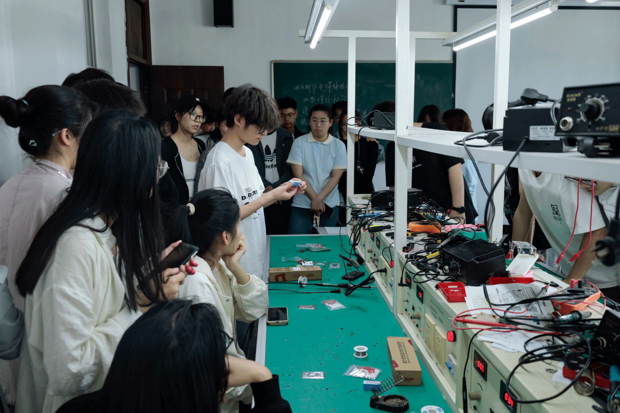 活动现场,主持人细致讲解各元器件的连接方式,并演示电烙铁的安全使用方法,为同学们的实践操作筑牢基础。随后,各小组迅速投入电路搭建工作。活动过程中,同学们专注认真,彼此交流想法、分享经验,充分展现出团队合作精神。遇到难题时,成员们共同探讨解决方案,在这个过程中,不仅是电路知识的运用,更是心理上的相互支持与鼓励。