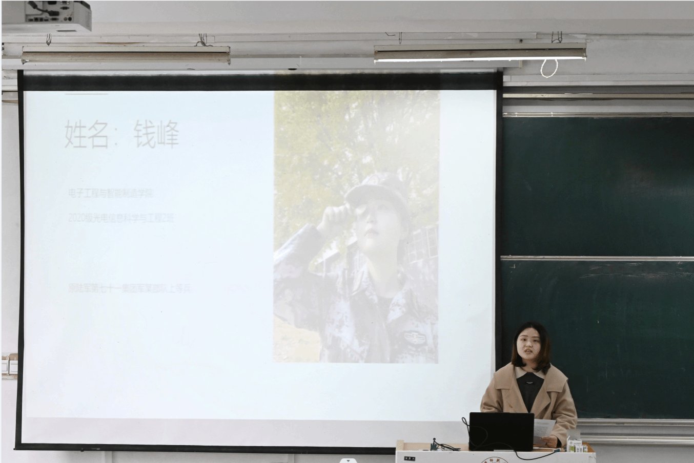 初入军营,接受新环境带来的挑战,光电信息科学与工程专业2020(2)班的钱峰不断进步,成为一名合格的军人。她向学员们分享了自己两年的军旅生活,从地方青年到授衔新兵,再成为新兵骨干,钱峰始终保持着积极进取的态度。“参军入伍让我体会到责任使命与担当,回归校园让我感受沉静理智与专注。学好专业技能是立身之本,遇到困难也要迎难而上,不轻言放弃。”