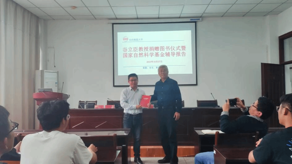 董甲东介绍了学院发展历程、办学定位、人才培养、科研平台建设成果、发展思路、科研成果转化等基本情况,并对谷立臣教授的亲临指导和学术专著捐赠表示衷心的感谢。随后,谷立臣教授与黄忠副院长进行了捐书仪式。